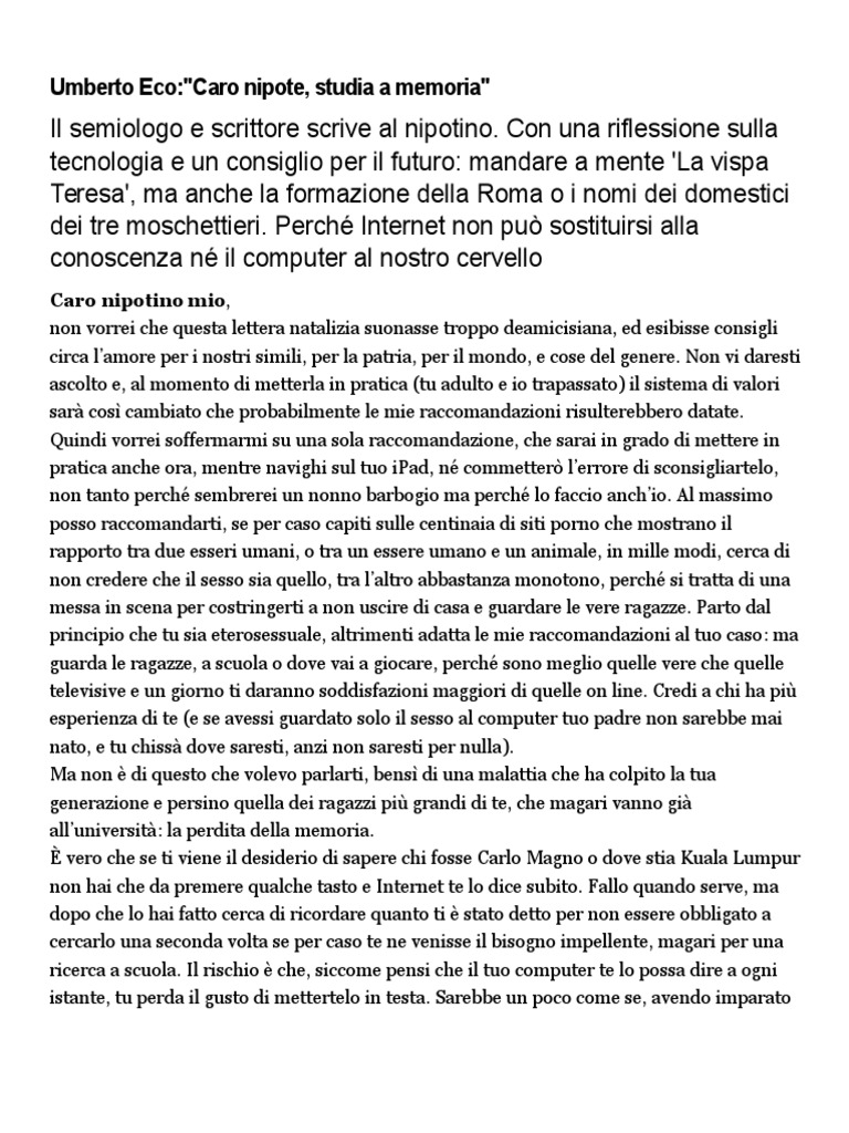 PDF Umberto Eco: Caro nipote, studia a memoria - lebellepagine.it Il semiologo e scrittore scrive al nipotino. Con una riflessione sulla tecnologia e un consiglio per il futuro: mandare a mente 'La vispa Teresa', ma anche la formazione della Roma o i nomi dei domestici dei tre moschettieri. Perché Internet non può sostituirsi alla conoscenza né il computer al nostro cervello di Umberto Eco