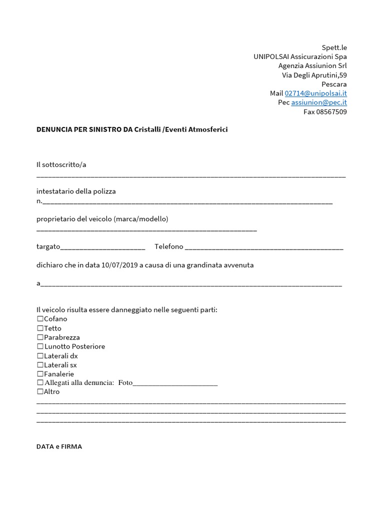 Fac simile denuncia danneggiamento dell'auto dalla grandine Jun 10, 2016 ... denuncia grandine sull'auto per assicurazione lettera assicurazione risarcimento danni grandine denuncia sinistro grandine fac simile