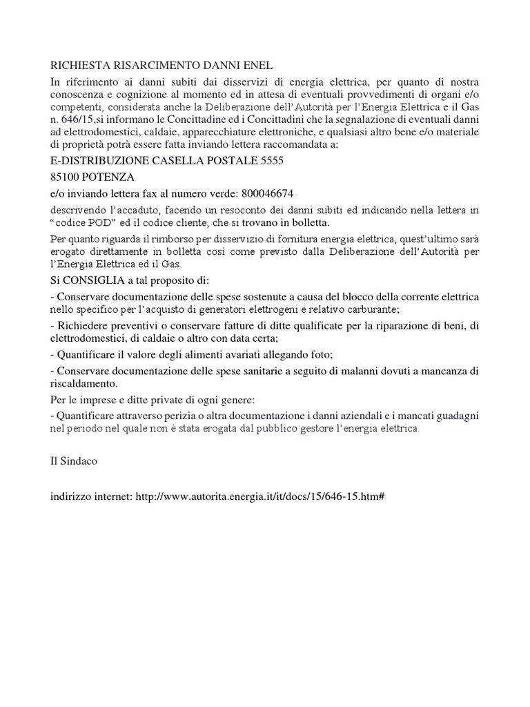 Fac simile lettera risarcimento danni enel